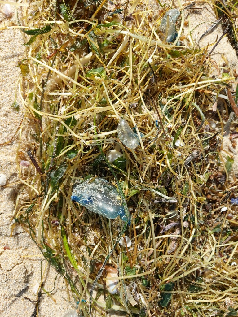 Sea wrack, piles of weed and seagrass, line the beach. The storms have torn them free from “rafts” of seagrass and algae that float beyond the surf line. The rafts are nurseries for juvenile fish and invertebrates such as sea snails, clams and crabs, and are essential to shoreline ecosystems. At my feet, small baby ‘blue bottle’ jellyfish shine in the sun